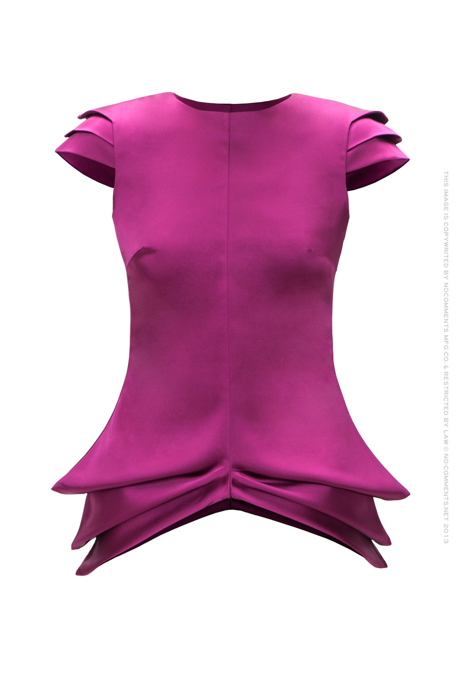 Топ создан для того чтобы соблюдать главное правило модницы: меняться, быть непредсказуемой и оригинальной. Он универсален по крою и практически не мнётся. Эффектный топ цвета фуксия можно надеть как на работу под деловой костюм, так и на романтическое свидание с летящей юбкой. Яркий топ геометричного кроя - хит любого сезона! Топ приталенный, удлинённый, сложный крой низа топа. Круглый вырез «под горло» Короткие рукава в виде трёхслойных углов — крылышек.